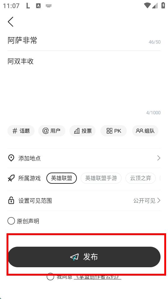 4、還能添加話(huà)題、發(fā)起投票等,選擇所屬游戲,設(shè)置可見(jiàn)范圍,勾選同意后,點(diǎn)擊發(fā)布按鈕,即可成功發(fā)布動(dòng)態(tài)。