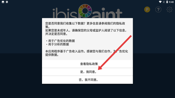 1、ibisPaint啟動時彈出隱私政策彈窗,點擊是,我同意,同意數(shù)據(jù)收集條款以繼續(xù)使用應(yīng)用。