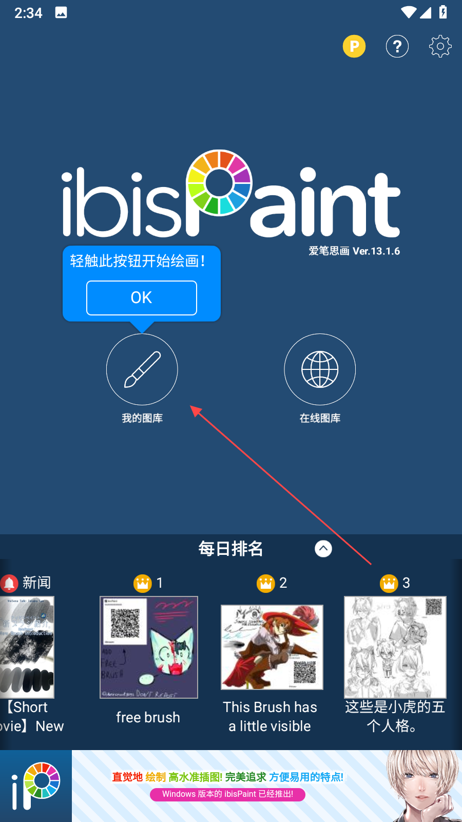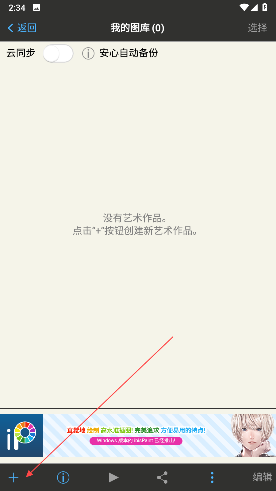 2、在我的圖庫(kù)界面,若沒(méi)有作品會(huì)提示點(diǎn)擊+按鈕創(chuàng)建新藝術(shù)作品,點(diǎn)擊底部+按鈕,進(jìn)入新建界面。