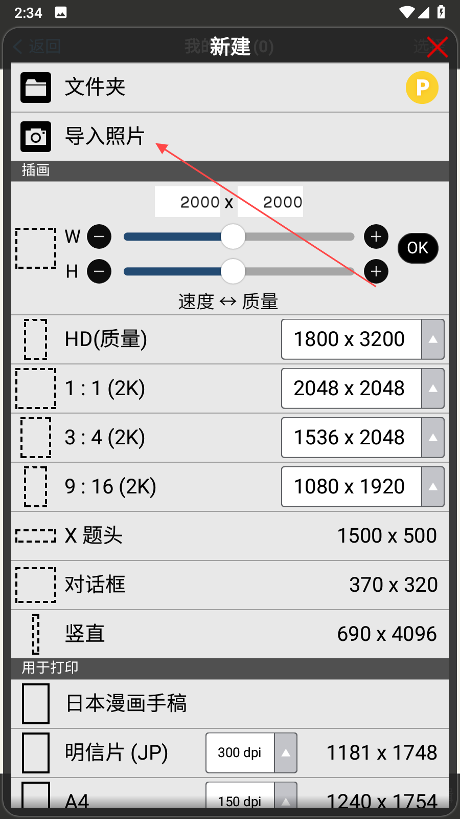 3、在新建界面中,點(diǎn)擊導(dǎo)入照片選項(xiàng),此時(shí)應(yīng)用會(huì)請(qǐng)求獲取訪問(wèn)相冊(cè)的權(quán)限,按提示允許后,便可從手機(jī)相冊(cè)里選擇想要導(dǎo)入的圖片,選中后確認(rèn)導(dǎo)入。