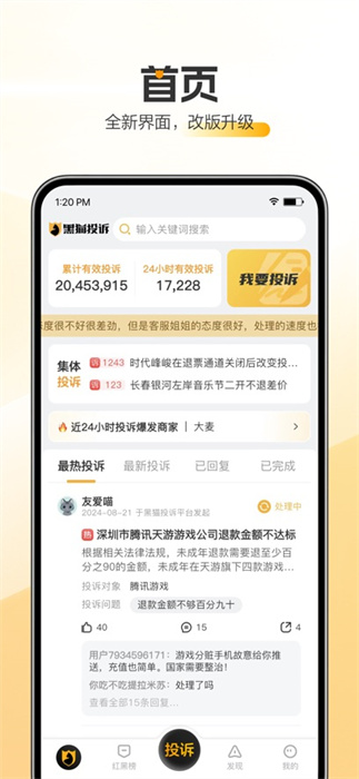 1、打開軟件點(diǎn)擊“投訴”,然后就會進(jìn)入投訴界面。