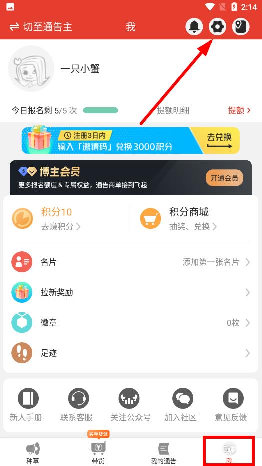 1、打開(kāi)螃蟹通告APP點(diǎn)擊底部導(dǎo)航欄中的我選項(xiàng),進(jìn)入個(gè)人頁(yè)面后點(diǎn)擊頁(yè)面右上角設(shè)置圖標(biāo)。