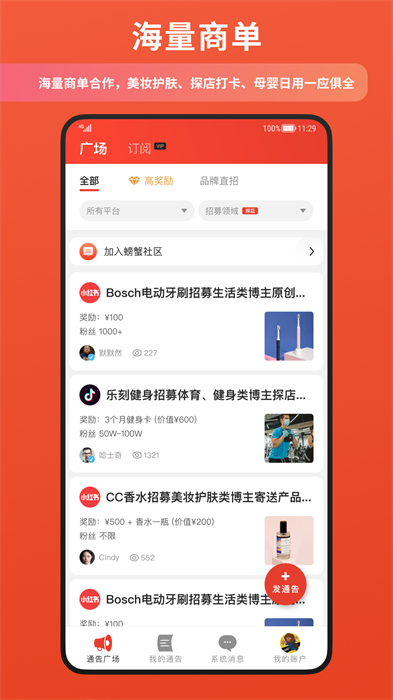 1、跨平臺(tái)海量商機(jī),擁有20W+活躍博主,1W+優(yōu)質(zhì)商家。