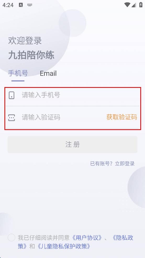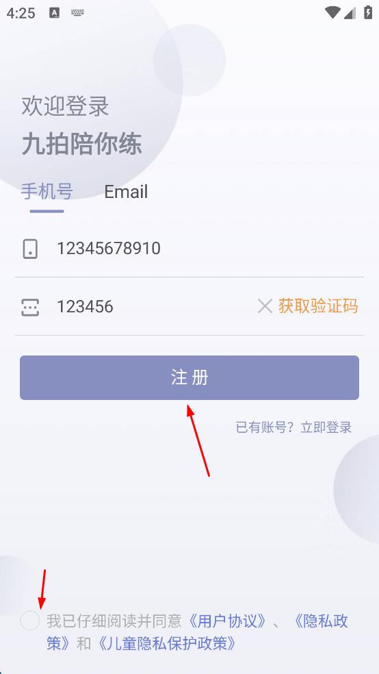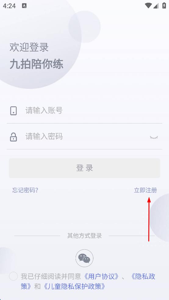 4、勾選我已仔細(xì)閱讀并同意用戶協(xié)議,隱私政策和兒童隱私保護(hù)政策,然后點(diǎn)擊“注冊(cè)”按鈕,完成九拍陪你練APP的注冊(cè)操作。