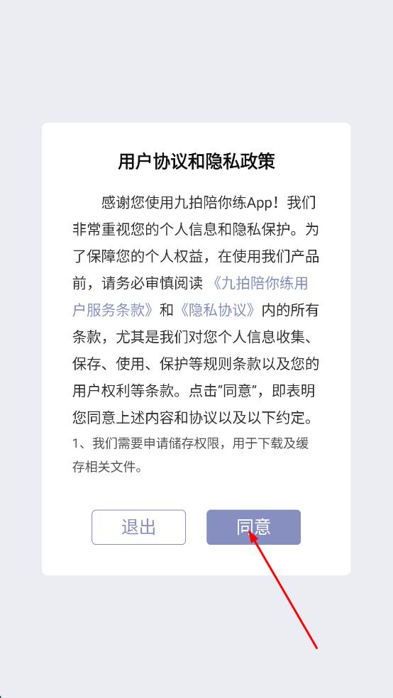 1、打開九拍陪你練APP,進(jìn)入用戶協(xié)議和隱私政策頁(yè)面,仔細(xì)閱讀相關(guān)內(nèi)容后,點(diǎn)擊“同意”按鈕,進(jìn)入登錄頁(yè)面。