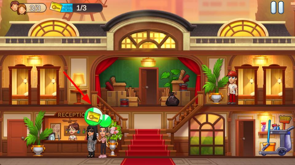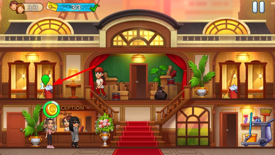 3、若房間使用后需要清潔,房間附近會(huì)出現(xiàn)帶有數(shù)字的清潔道具圖標(biāo),點(diǎn)擊圖標(biāo),讓工作人員去打掃房間,維持旅店整潔。