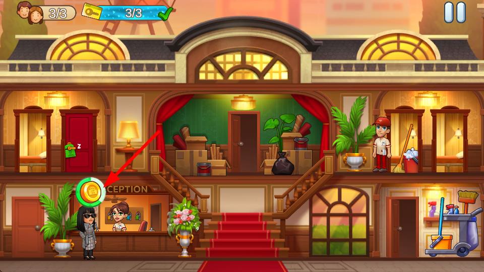 1、關(guān)注左上角人物頭像圖標(biāo),按照綠色箭頭指示點(diǎn)擊空房間,將顧客安排入住。