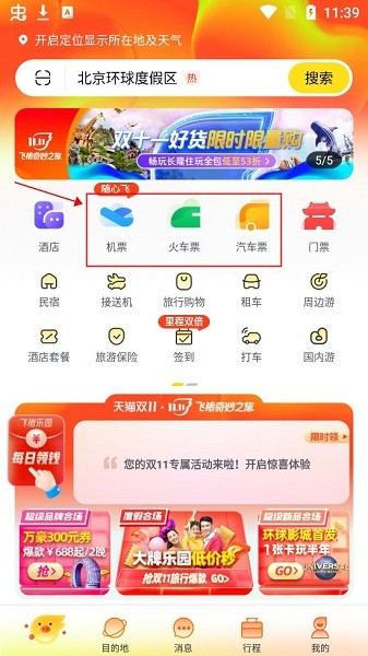1、進入飛豬app后會看到機票、火車票、汽車票、門票四種購票專區(qū),這里以火車票為例
