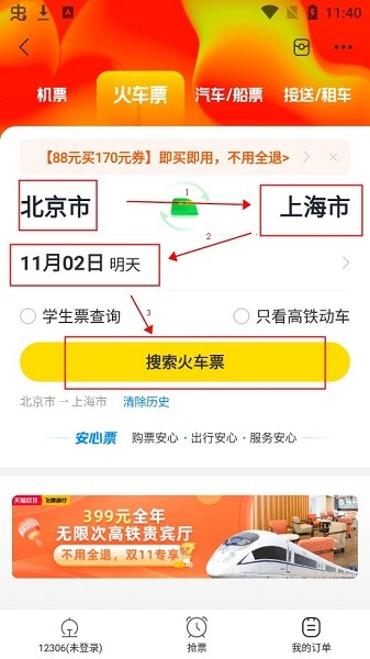 2、點擊火車票后選擇出發(fā)地和目的地,接著選擇時間,確定后點擊“搜索火車票”