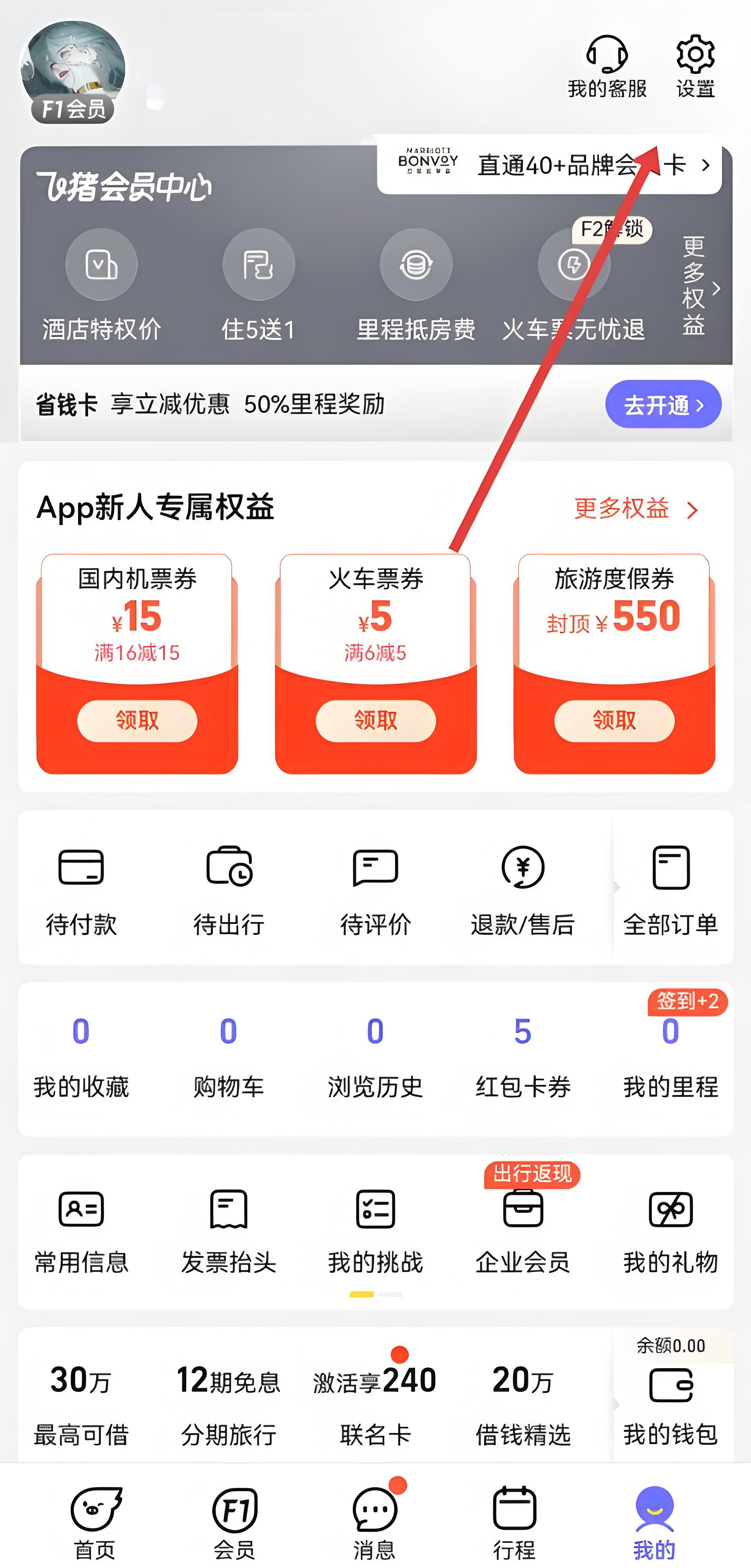 1、在飛豬旅行我的頁面,點擊右上角設(shè)置,進入設(shè)置的界面。