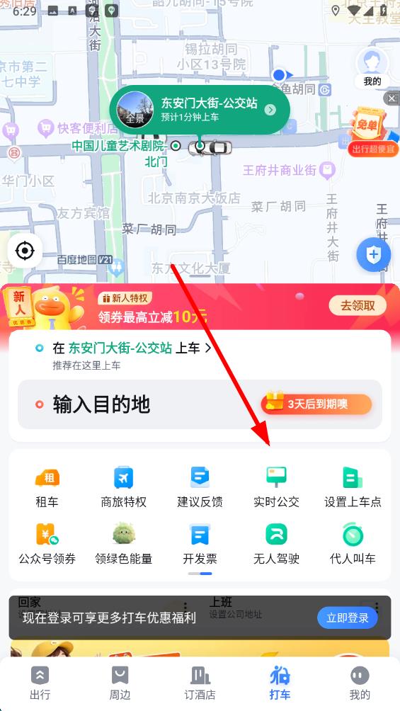 2、在打車(chē)界面中,找到并點(diǎn)擊實(shí)時(shí)公交按鈕,進(jìn)入實(shí)時(shí)公交查詢(xún)頁(yè)面。