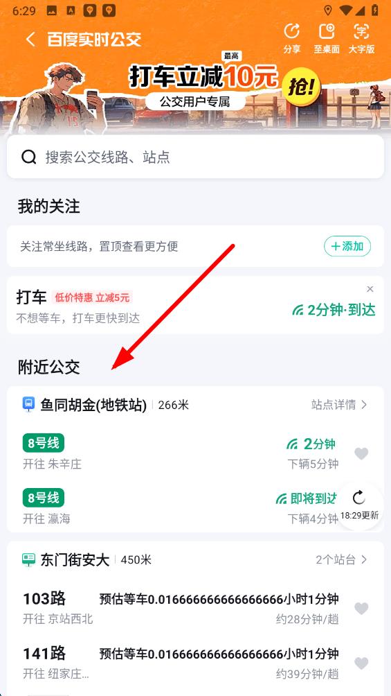 3、在實(shí)時(shí)公交查詢(xún)頁(yè)面的附近公交區(qū)域,可查看距離自己較近的公交站點(diǎn)及線(xiàn)路信息,包括公交車(chē)的預(yù)計(jì)到達(dá)時(shí)間等。