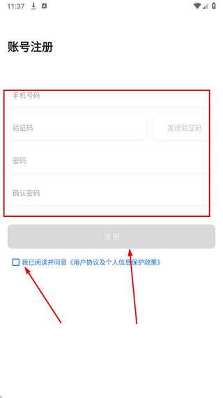 2、輸入手機號碼,填入驗證碼,設(shè)置密碼并確認(rèn)。勾選用戶協(xié)議,點擊注冊。