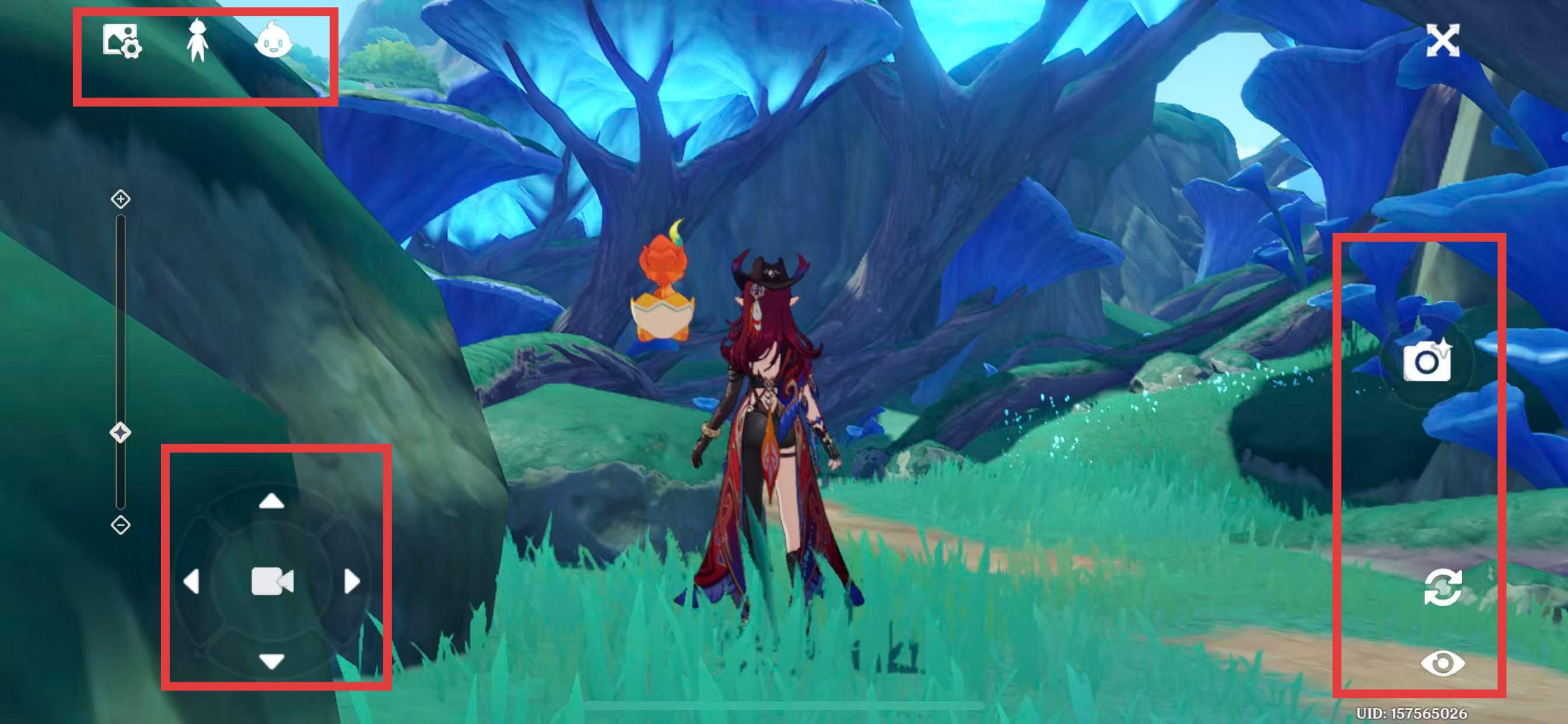 3、左下角是調(diào)整拍照角度,右側(cè)從上至下分別是拍照按鈕、重置鏡頭按鈕、切換視角按鈕,點擊左上方的三個小圖標,選擇不同的拍照濾鏡、姿勢和特效。