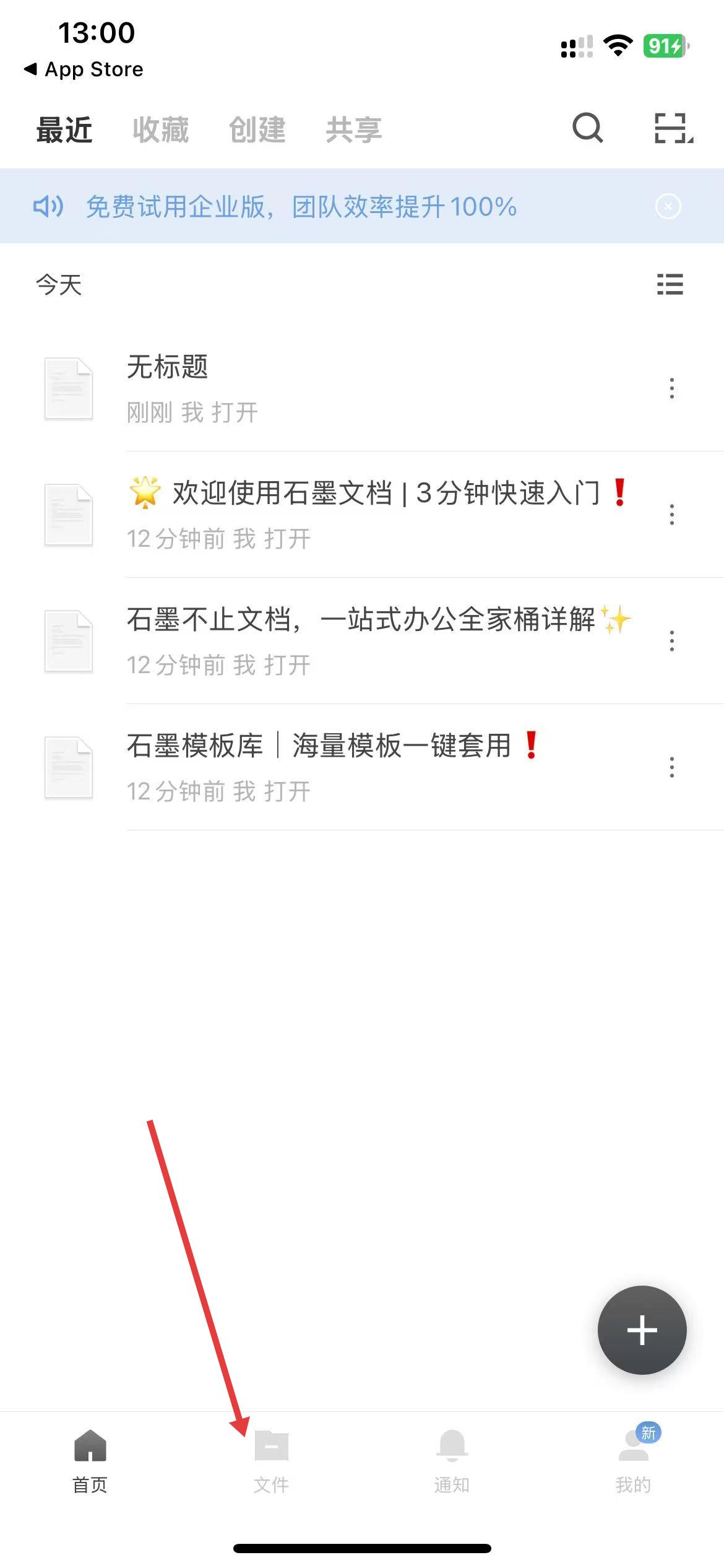 1、打開(kāi)石墨文檔APP,點(diǎn)擊底部導(dǎo)航欄中的文件選項(xiàng)。