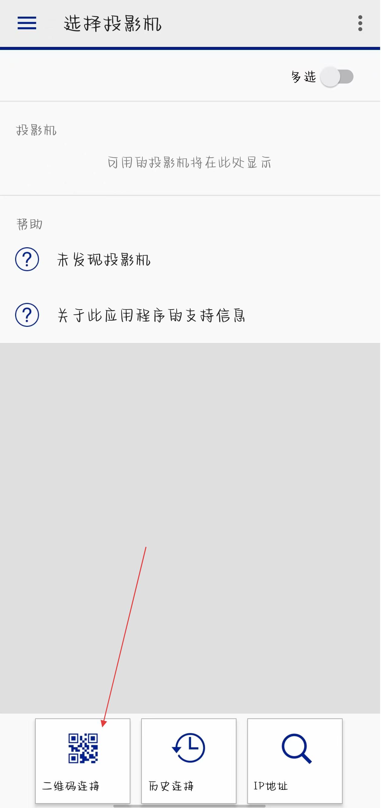 1、打開Epson iProjection應(yīng)用,在主界面下方選擇二維碼連接。
