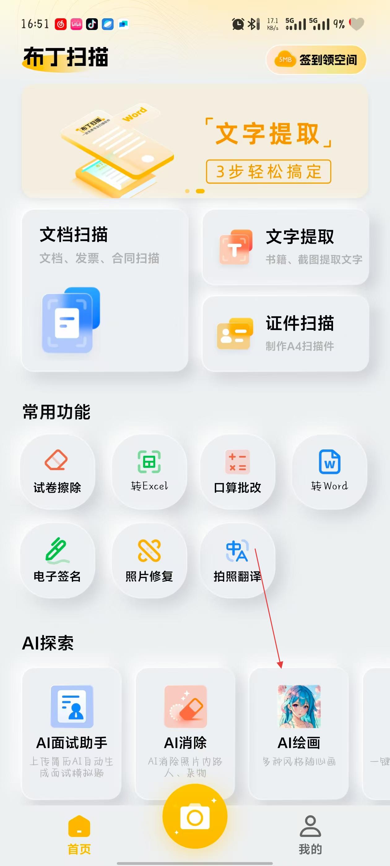 1、打開布丁掃描APP,在首頁找到并點(diǎn)擊AI繪畫功能模塊,進(jìn)入AI繪畫相關(guān)頁面。