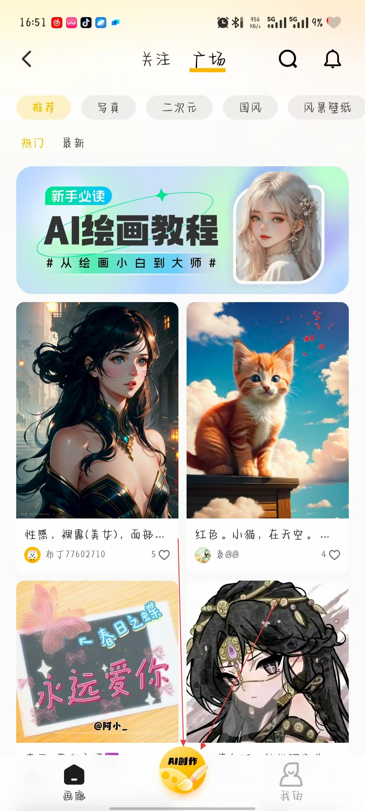 2、在AI繪畫頁面,點(diǎn)擊底部的AI創(chuàng)作按鈕,進(jìn)入具體的創(chuàng)作設(shè)置界面。