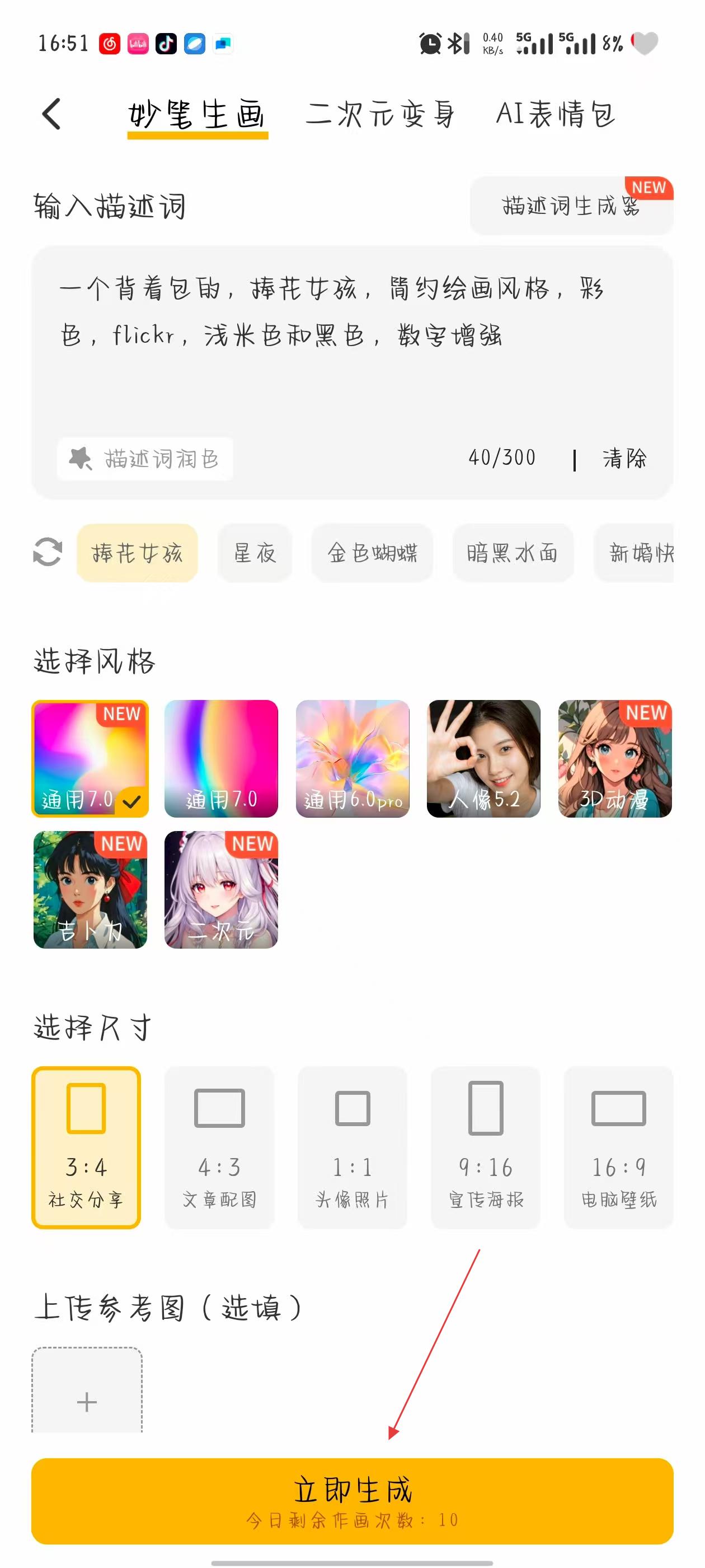 3、在創(chuàng)作界面的輸入描述詞,點(diǎn)擊底部的立即生成按鈕,等待AI生成圖像。