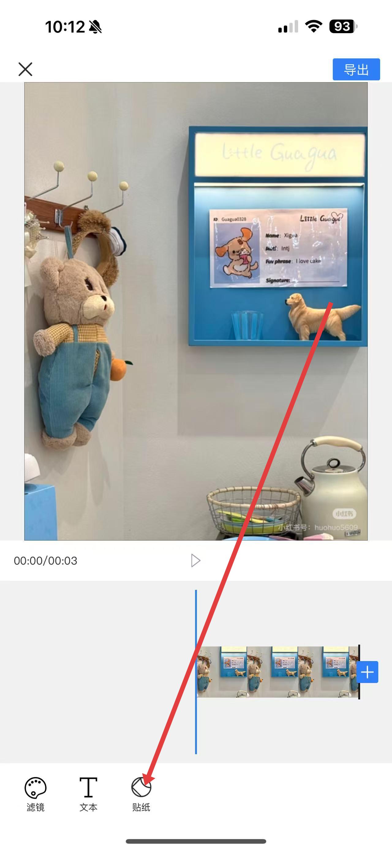 3、選中貼紙圖片素材并添加到視頻后,點(diǎn)擊視頻編輯界面下方的貼紙選項(xiàng)。