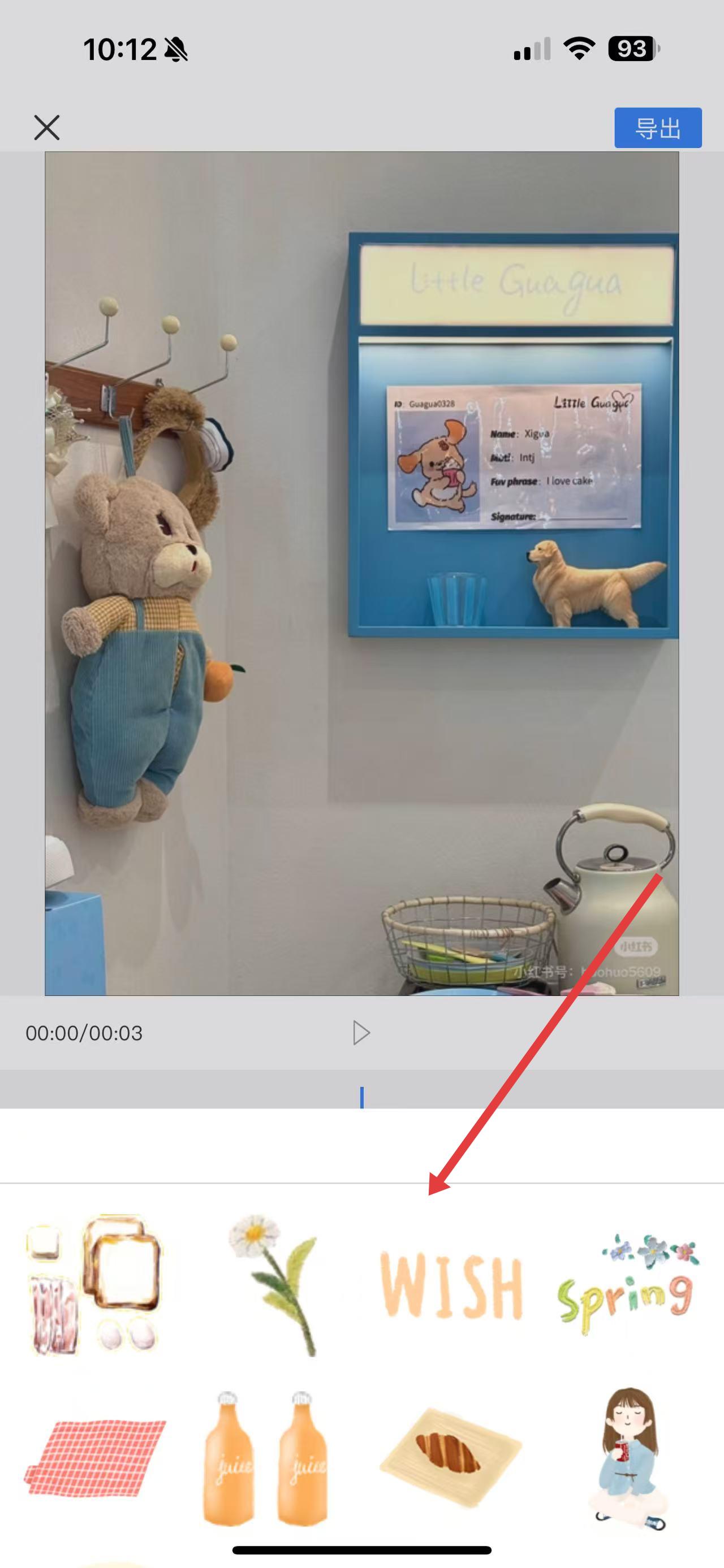 4、在下方出現(xiàn)的貼紙選擇欄中,挑選自己喜歡的貼紙樣式并添加到視頻對(duì)應(yīng)位置。