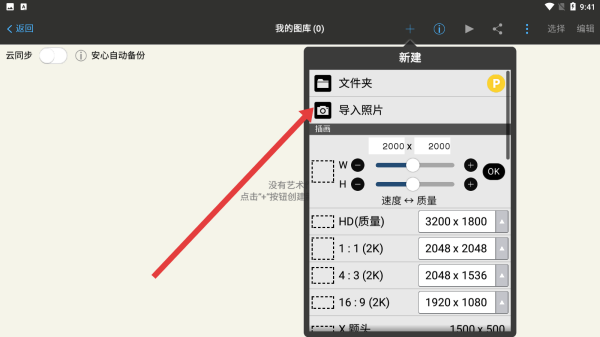 3、在新建菜單中,點(diǎn)擊導(dǎo)入照片選項(xiàng),可從設(shè)備相冊(cè)選取圖片導(dǎo)入,導(dǎo)入到應(yīng)用中進(jìn)行繪畫(huà)創(chuàng)作或編輯處理。