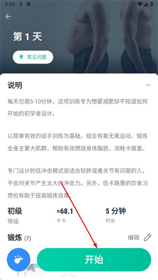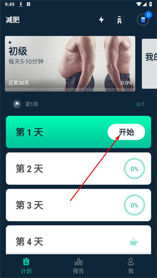 1、打開30天內(nèi)減肥男士版APP,在計(jì)劃頁面找到第1天的減肥訓(xùn)練計(jì)劃,點(diǎn)擊開始。