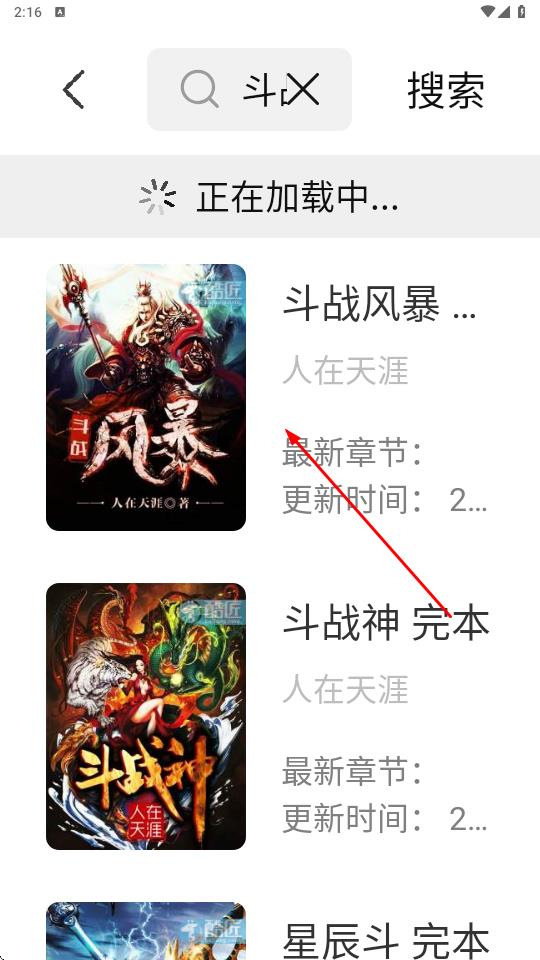 2、在搜索結(jié)果加載完成后,瀏覽列表,選擇目標(biāo)小說如斗戰(zhàn)風(fēng)暴,點(diǎn)擊進(jìn)入小說詳情頁面。