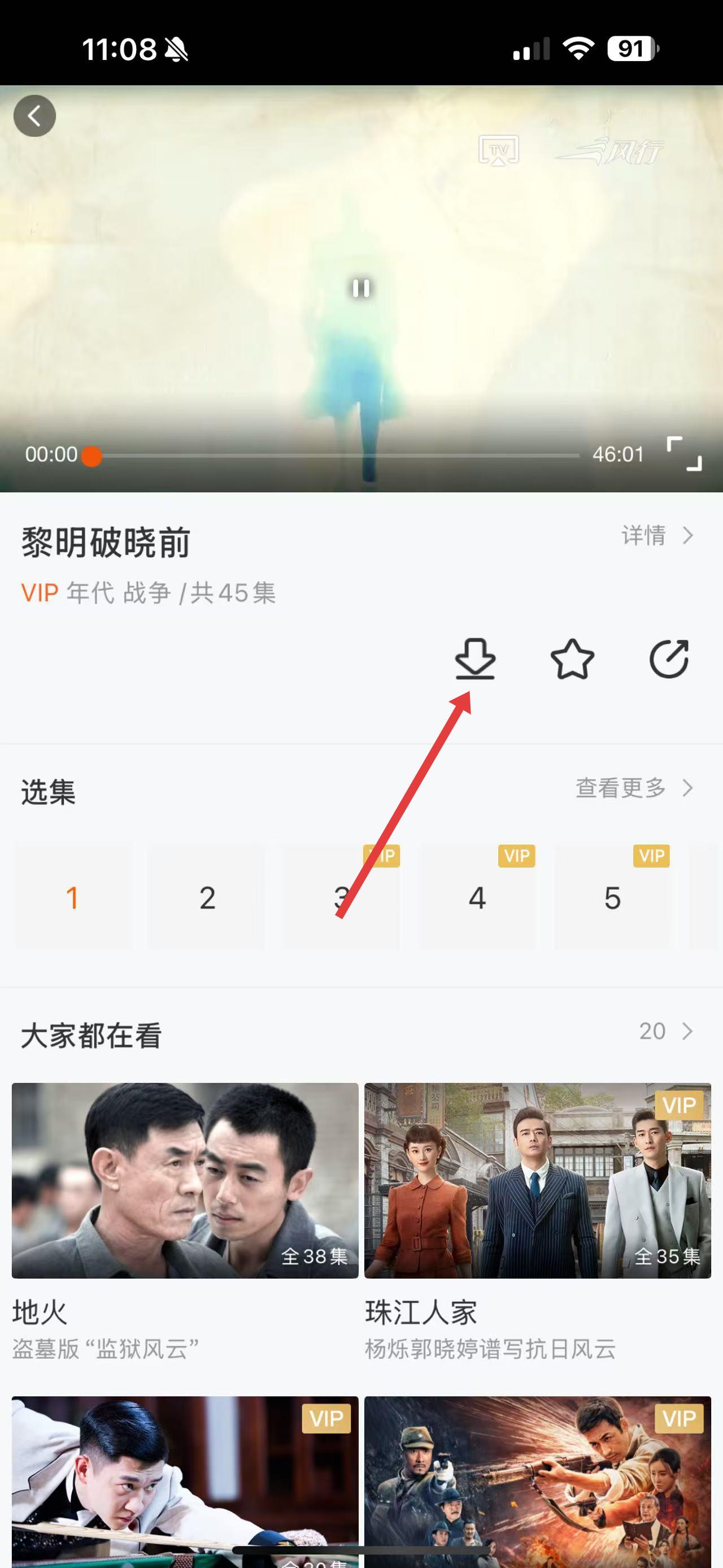 2、點擊進入該電視劇的播放頁面,在播放界面下方找到并點擊下載圖標。