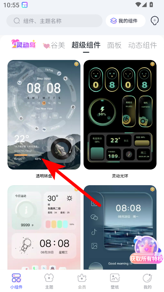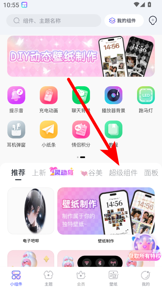 2、在應(yīng)用主界面,點(diǎn)擊上方的“超級(jí)組件”選項(xiàng),進(jìn)入到超級(jí)組件展示頁(yè)面。