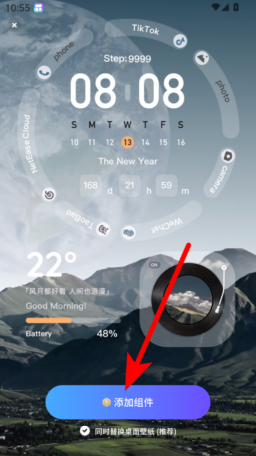 4、在組件詳情頁(yè)面,點(diǎn)擊添加組件按鈕,若想同時(shí)更換桌面壁紙,可勾選同時(shí)替換桌面壁紙推薦,完成組件添加操作。