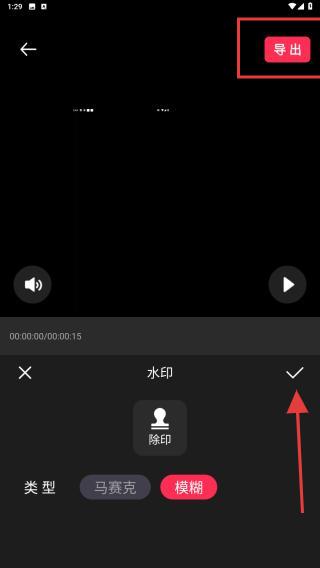 4、可選擇馬賽克、模糊等去水印方式,操作完成后,先點(diǎn)擊打鉤的圖標(biāo),再點(diǎn)擊頁(yè)面右上角的導(dǎo)出按鈕。