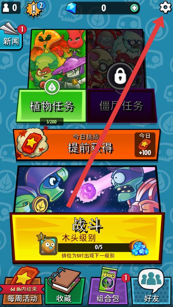 1、打開(kāi)植物大戰(zhàn)僵尸英雄進(jìn)入主界面,點(diǎn)擊右上角的設(shè)置圖標(biāo)。