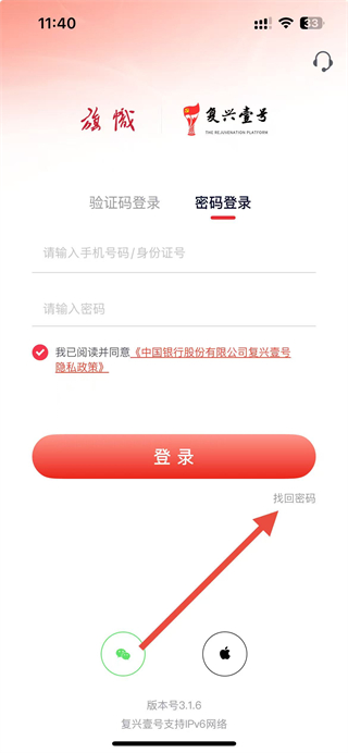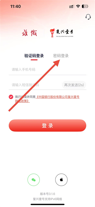 1、打開復興壹號APP,在登錄頁面點擊密碼登錄選項。