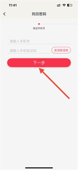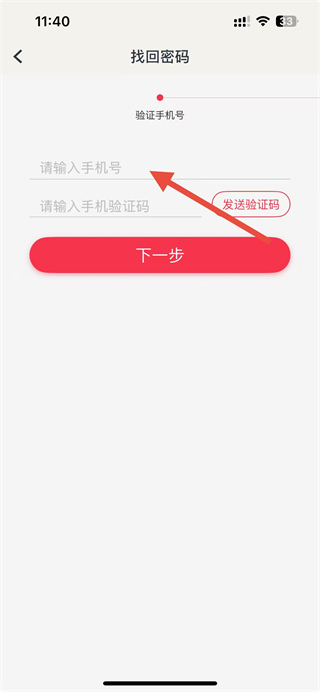 3、在找回密碼頁面,輸入手機號,點擊發(fā)送驗證碼并輸入驗證碼。
