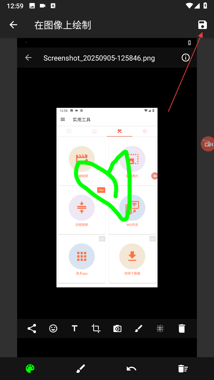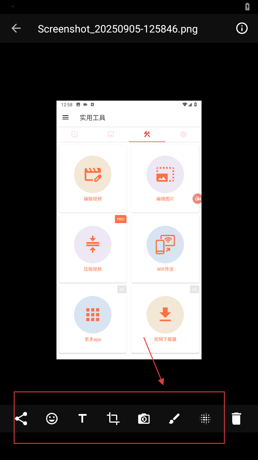 3、在圖片預(yù)覽界面底部,可使用分享、添加表情、輸入文字、裁剪、繪圖等工具,對(duì)圖片進(jìn)行拼接、模糊、裁切、添加文字或手繪等操作。