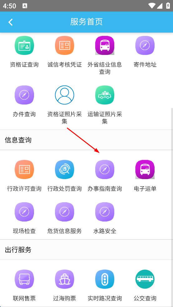 2、在服務(wù)首頁(yè),找到“辦事指南查詢”功能并點(diǎn)擊,進(jìn)入辦事指南列表頁(yè)。