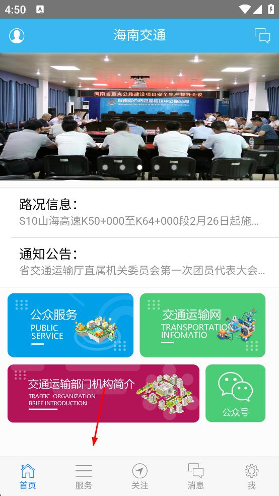 1、打開(kāi)海南交通APP,在首頁(yè)點(diǎn)擊底部“服務(wù)”選項(xiàng),進(jìn)入服務(wù)首頁(yè)。