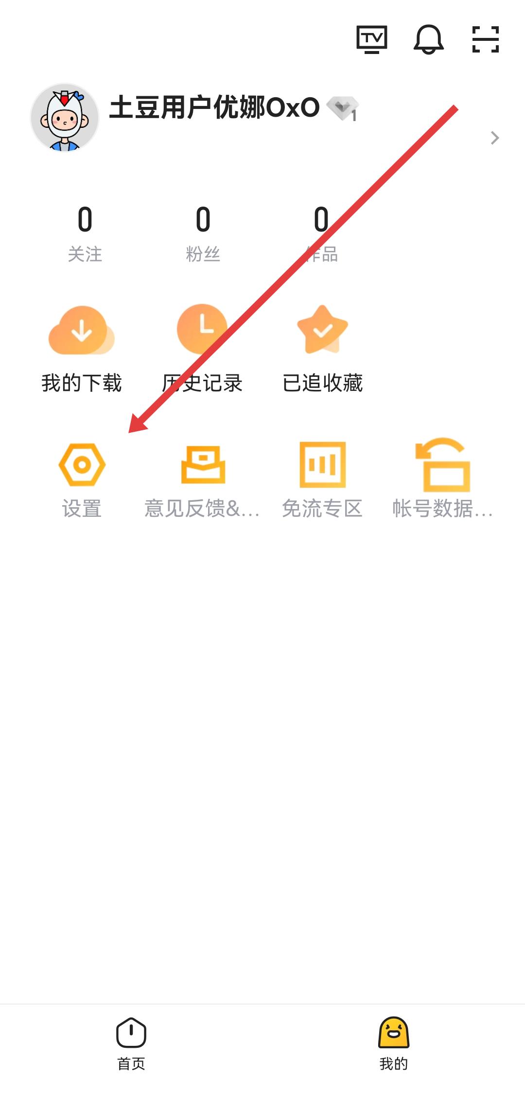1、打開土豆視頻APP,進(jìn)入我的頁(yè)面后,點(diǎn)擊設(shè)置的圖標(biāo),進(jìn)入設(shè)置功能的界面。