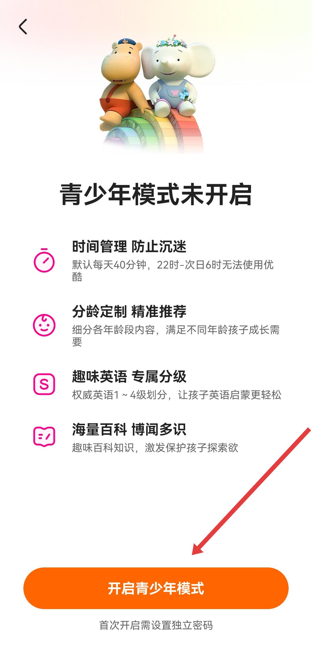 3、在青少年模式頁(yè)面,點(diǎn)擊下方的開啟青少年模式按鈕,之后按照提示設(shè)置獨(dú)立密碼,即可成功開啟青少年模式。