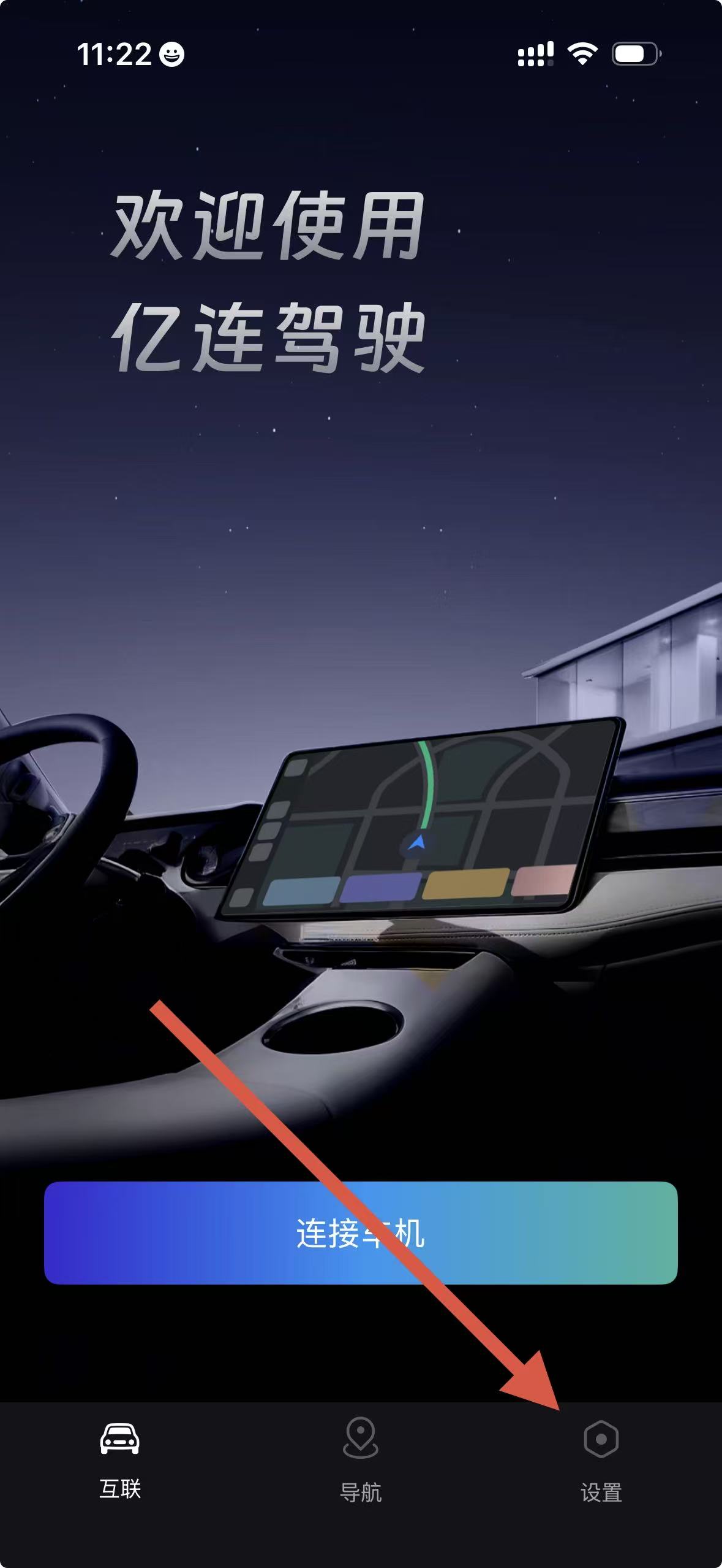 1、打開億連駕駛助手app,在歡迎頁面點(diǎn)擊下方設(shè)置選項(xiàng),進(jìn)入設(shè)置界面。