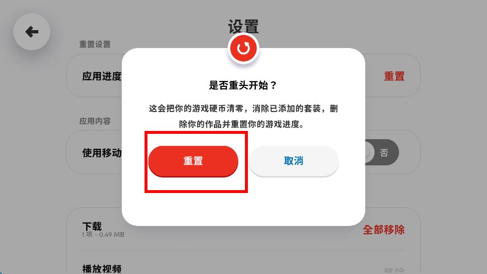 4、在彈出的確認窗口中,閱讀相關(guān)提示后點擊重置按鈕即可將游戲進度重置,包括游戲硬幣清零、清除已添加套裝等操作。