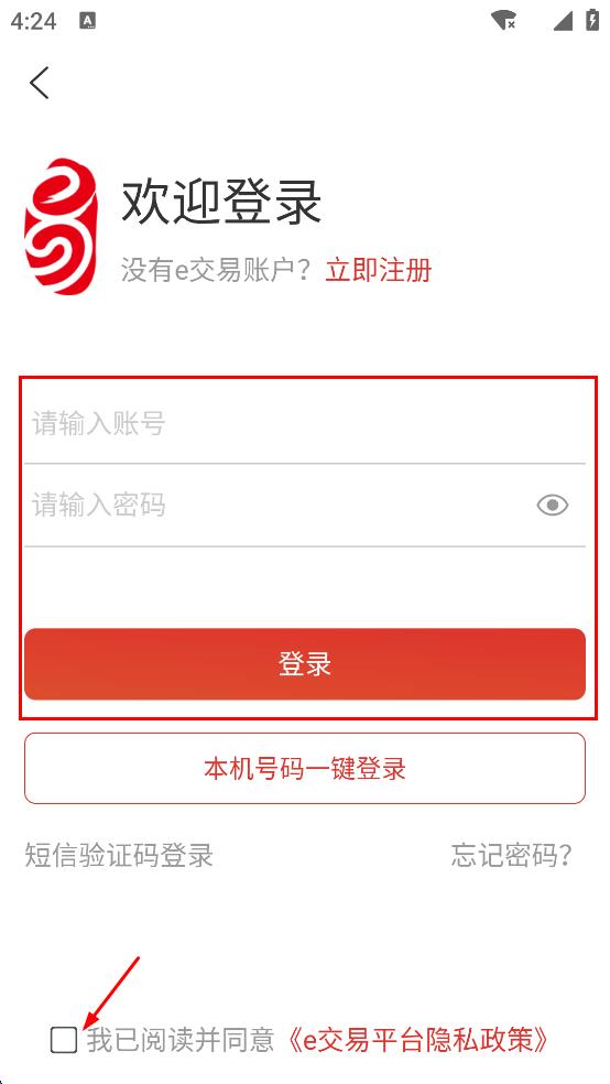 4、在登錄界面,勾選我已閱讀并同意e交易平臺隱私政策,輸入賬號和密碼,點擊“登錄”。