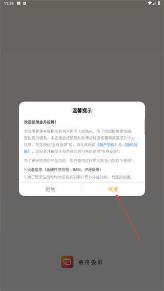 1、打開金舟投屏APP,進(jìn)入時(shí)會彈出溫馨提示,閱讀后點(diǎn)擊同意的按鈕。