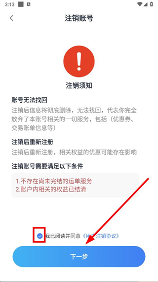 4、在注銷賬號頁面勾選同意相關(guān)協(xié)議后點(diǎn)擊下一步按鈕,按提示完成賬號注銷操作。