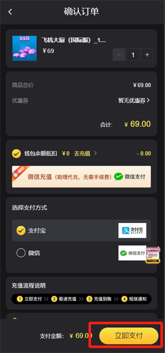 3、然后在支付頁面,能夠選擇支付寶或者是微信去充值,點擊下方的【立即支付】;