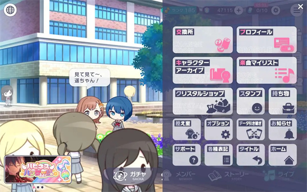 下方從左到右分別為:GACHA(抽卡)、MEMBER(人物)、STORY(劇情)、LIVE(打歌)