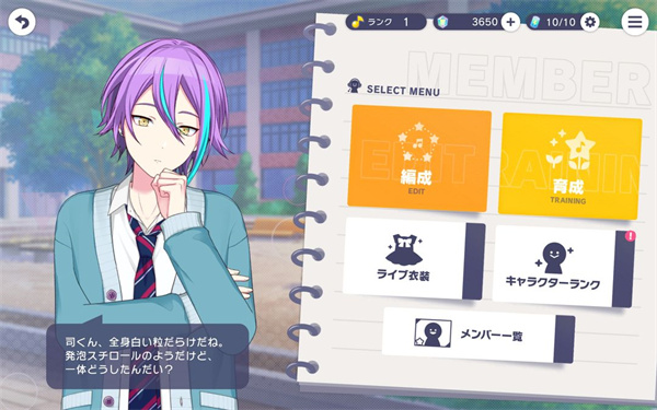 總體包括編成、育成、“ライブ衣裝”【現(xiàn)場服裝】、“キャラクターランワ”【角色等級】、“メンバー一覽”【會員名單】