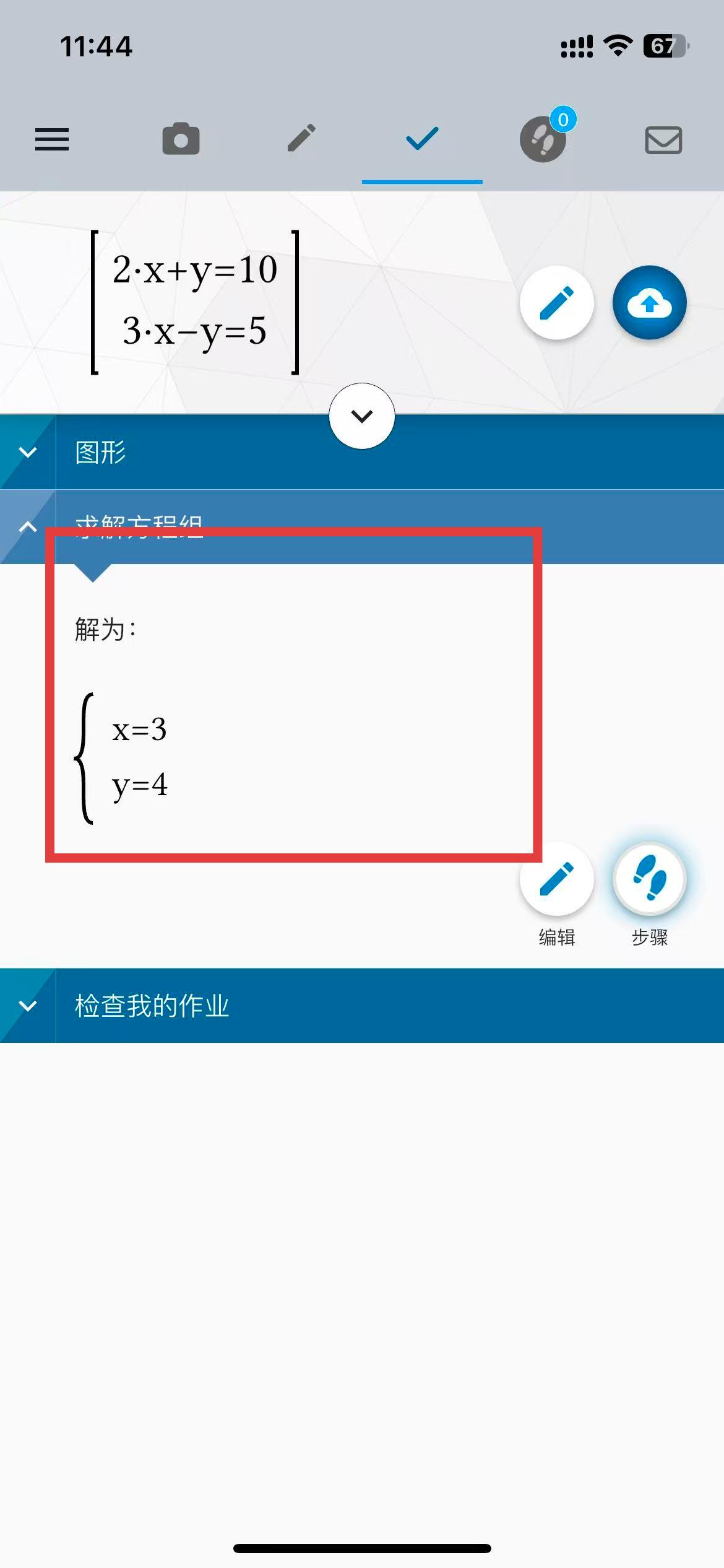 4、點擊后,再展開的頁面中即可查看方程組的解。