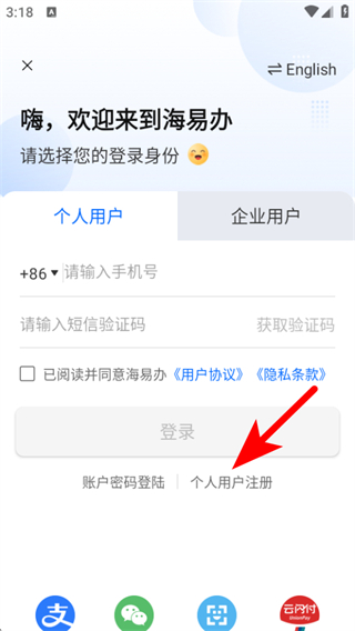 2、在登錄界面,點擊個人用戶注冊,進入注冊方式選擇的頁面。